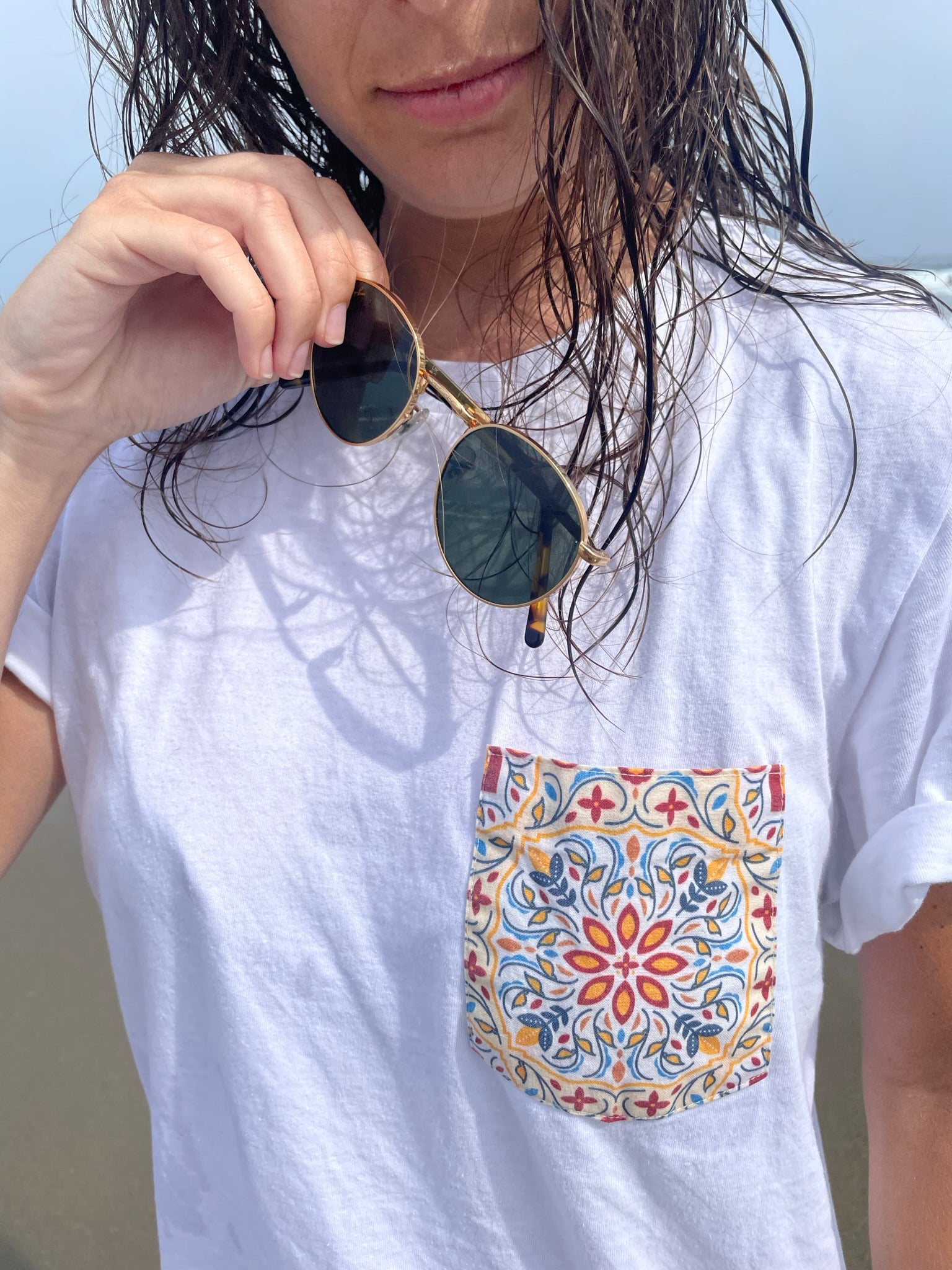 I’ve gotten so many compliments on this unique design! The pocket and shirt are both great quality. I’m 5’2 and ordered a size M - it’s the perfect fit for a loose fitting beach tee for the summer. Will definitely be ordering more!